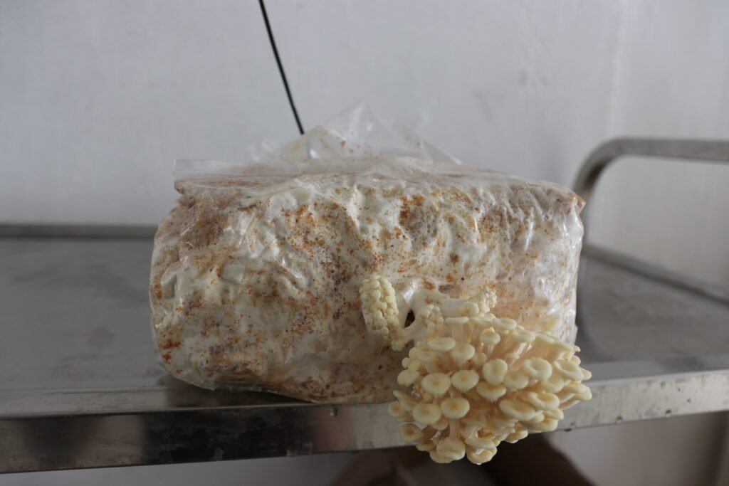 - The mushroom spawn is mixed into the substrate by shaking and kneading the bag.