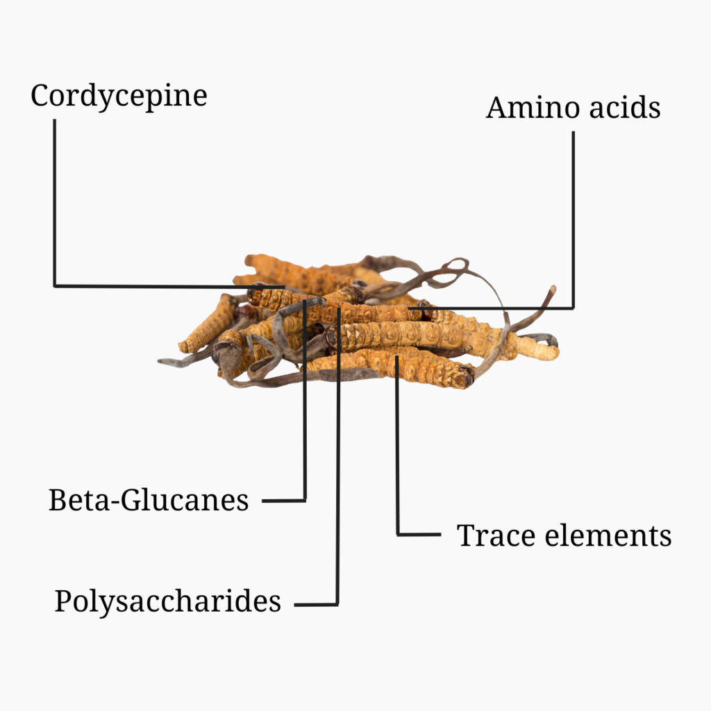 Cordyceps contains naturally occurring substances such as Cordycepin, Adenosine, and Polysaccharides, which are of interest to scientists for their diverse biochemical properties. The mushroom is notable not only for its historical use in TCM but also for its unusual life cycle and the precision required to cultivate it in modern production.