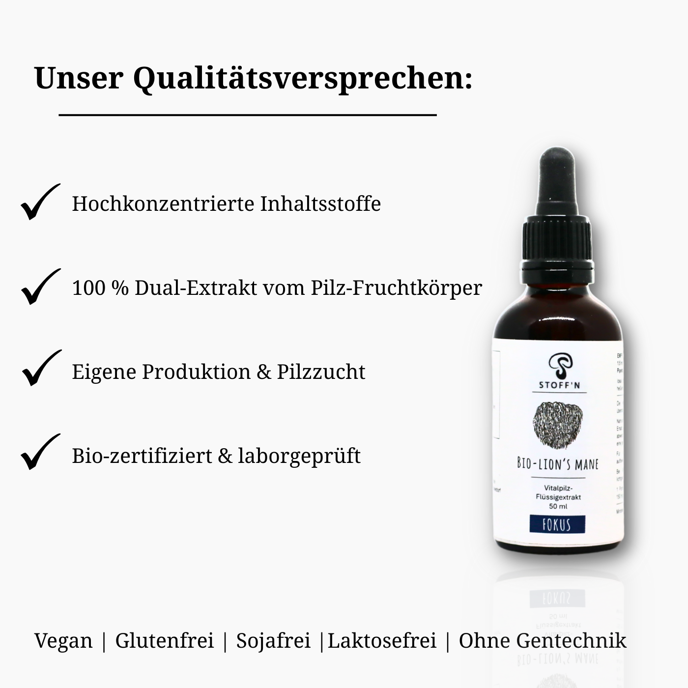 At Stoff’n, quality, transparency, and responsibility are at the heart of every step. From cultivation and extraction to bottling, each phase takes place under controlled conditions in our in‑house facility — ensuring a consistent, pure product with the full character of organic Lion’s Mane.