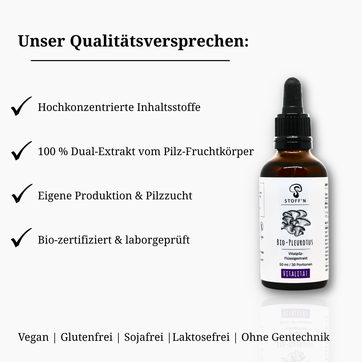 At Stoff’n, transparency, responsibility, and quality are our priorities. Every step – from mushroom cultivation to extraction and bottling – takes place in-house. This ensures a pure product that preserves the natural integrity of the Pleurotus mushroom.