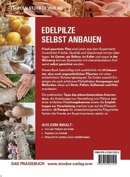 Dieses Buch beschäftigt sich ausführlich mit 21 bekannten, aber auch ungewöhnlichen Speisepilzen und den Methoden, diese selbst anzubauen. Es enthält Tipps für Einsteiger zum Anbau von Pilzen in Räumen und im Freien, auf Stroh, Pellets, Kaffeesatz und Holz. Ambitionierte Pilzzüchter finden darin neben Anregungen zur experimentellen Pilzzucht von Morcheln, Waldpilzen und Trüffeln auch Hinweise zum vegetativen Vermehren sowie Anleitungen zum Bau einer Fruchtungskammer. Empfehlungen zur Verarbeitung sowie Rezepte für abwechslungsreiche Pilzgerichte machen Lust auf die Pilzzucht daheim.
